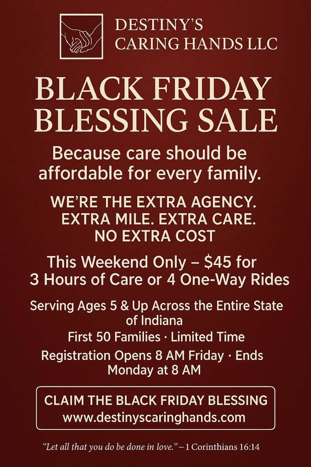 Office: (574) 318-4984 Fax: (574) 318-4198 Email: info@destinyscaringhands.com